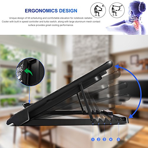2. Switch off the fans of the laptop cooler after a long working day and rest. ➼ ADJUSTABLE HEIGHT AND VENTILATION: Laptop cooler with options for using 2, 4 or all 6 fans. Manual mode to set the speed as desired, and adjustable tiltable, ergonomic stand with 5 adjustable height settings to play games or watch movies in the most comfortable angle.